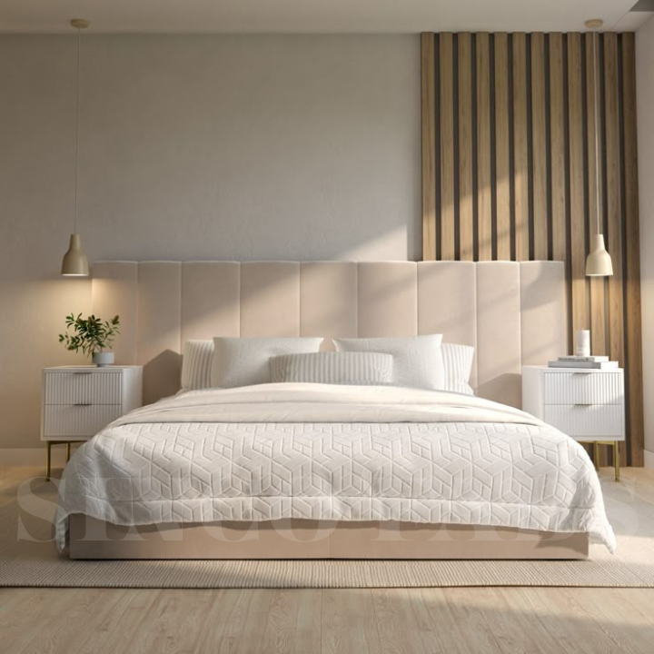 Luxurious Beige Bed with Wide Tufted Headboard & Storage.