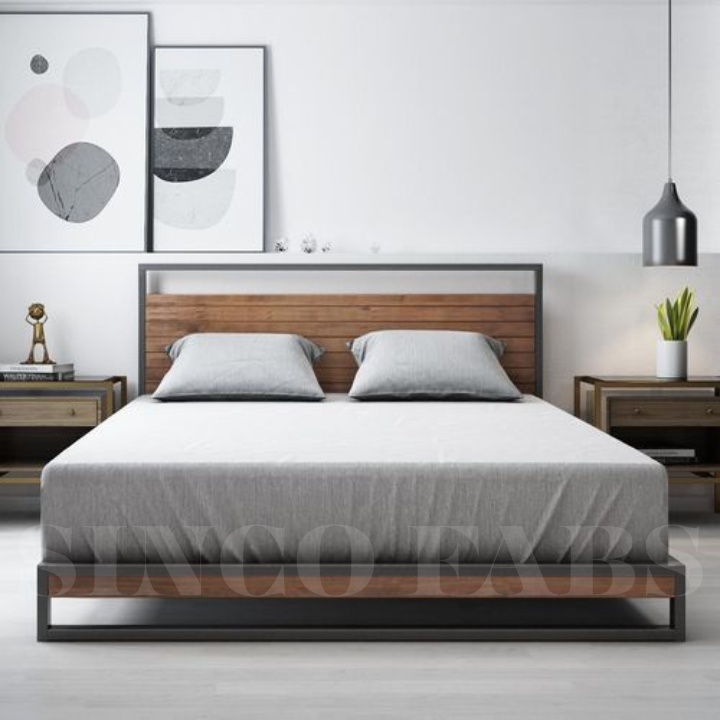 Ironline Fusion Bed: Modern Metal Frame with Warm Wood Headboard.