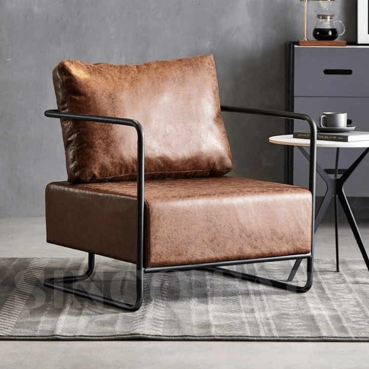 STYLISH BLACK METAL ARMCHAIR WITH LUXURIOUS BROWN LEATHER UPHOLSTERY