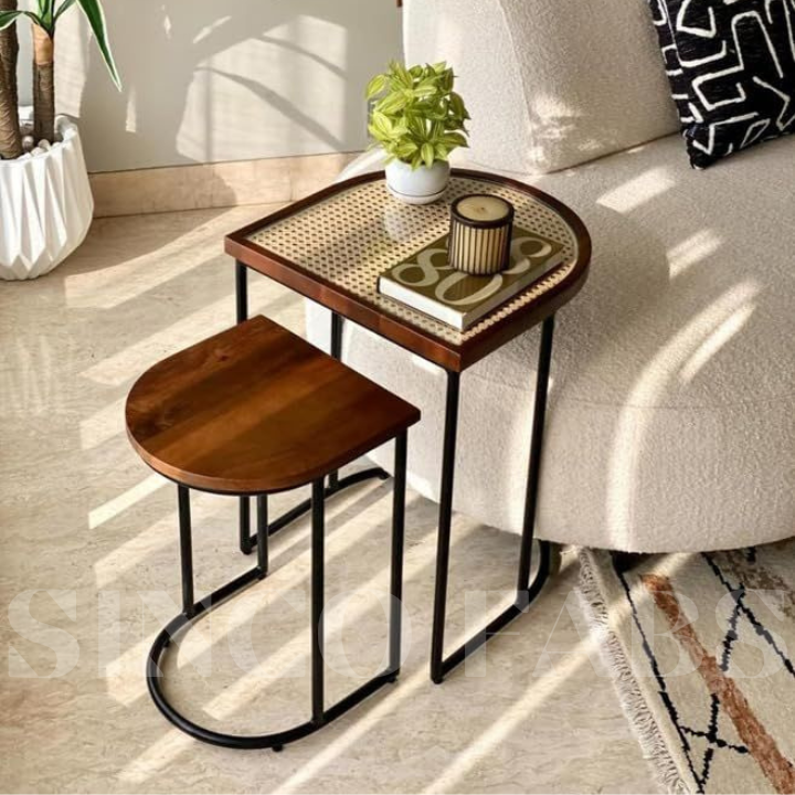 Vodro Arc Serve: Modern Black Metal Side Table with Rattan & Wood Shelves