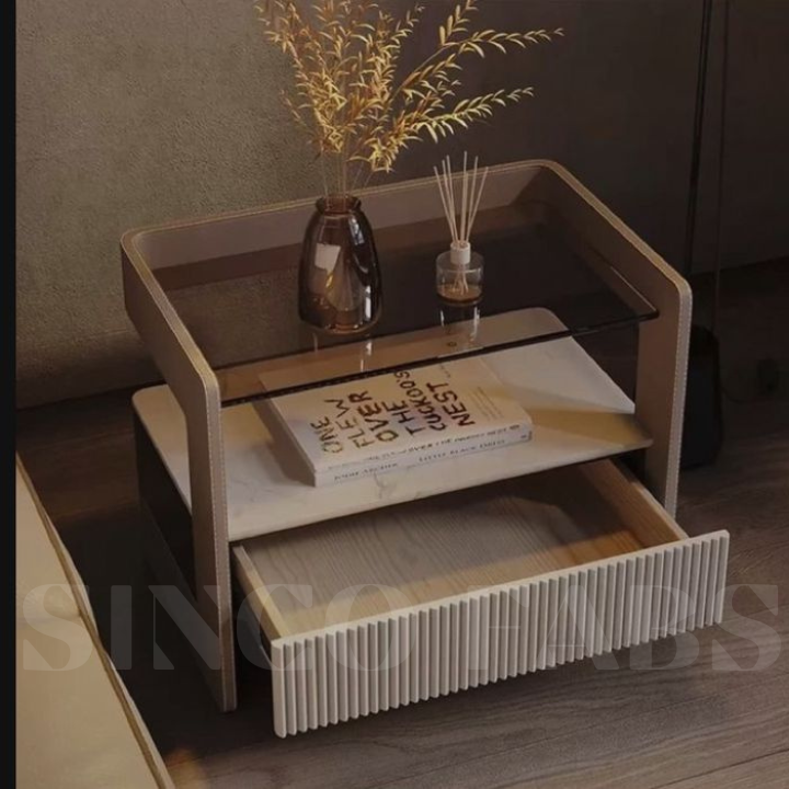 Enhance your bedroom in Thrissur with the Luxe Curve Nocturne nightstand. Its elegantly curved, light-colored upholstered frame...
