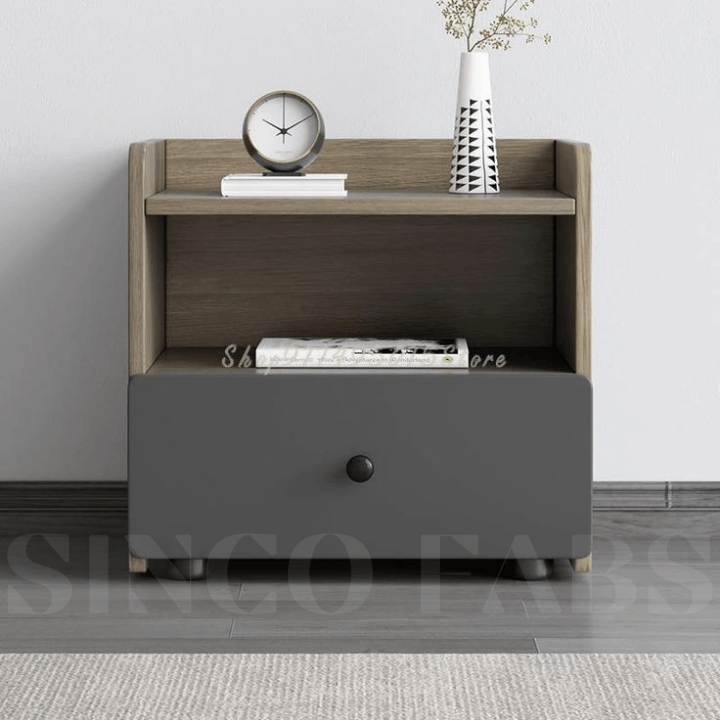 Enhance your bedroom in Thrissur with the Carroll Storage Nocturne nightstand. Its sleek design features a light wood-grain top and shelf, complemented by a spacious grey drawer for ample bedside storage.
