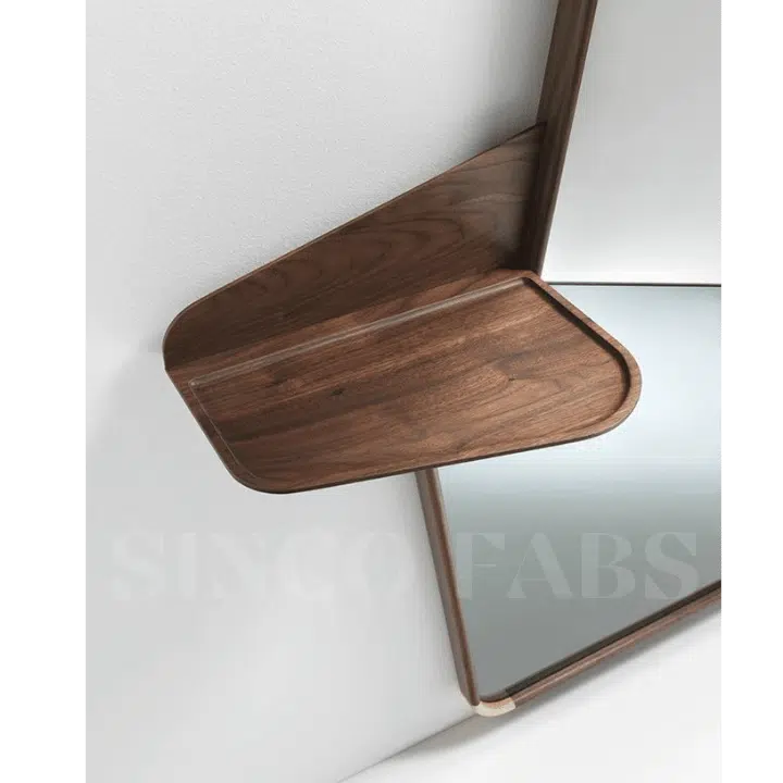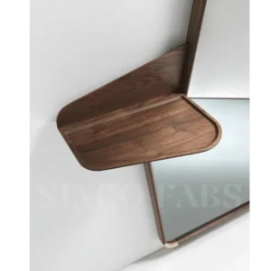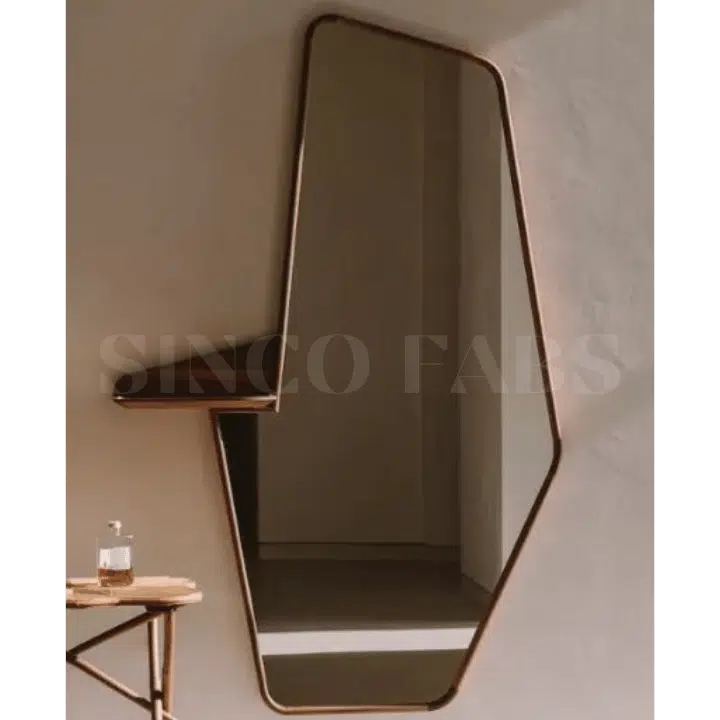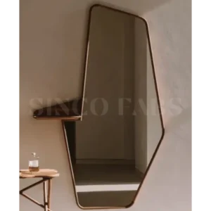 Maximize style in any space with this elegantly designed wall mirror. Its unique geometric shape and attached floating shelf create a sophisticated and functional focal point.