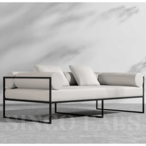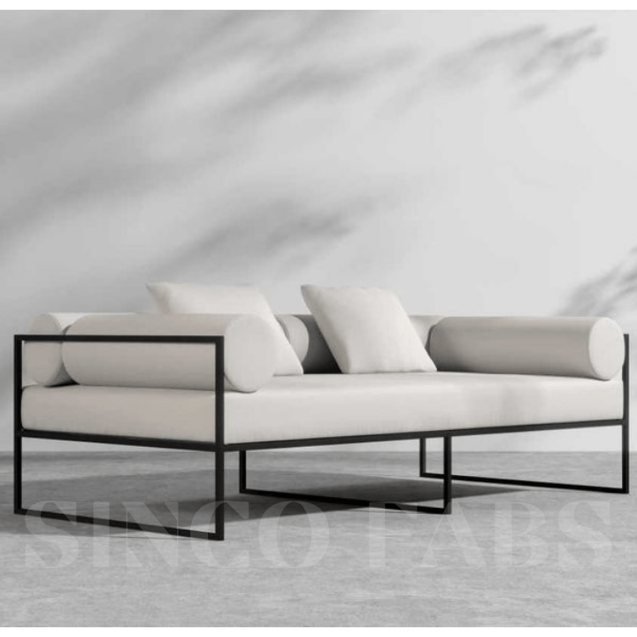 Elevate your outdoor living in Kerala with the Everett Pure Form two-seater. Crafted with a clean-lined dark metal frame and sumptuously soft light cushions with supportive bolster pillows, this modern piece offers both understated style and ultimate relaxation.
