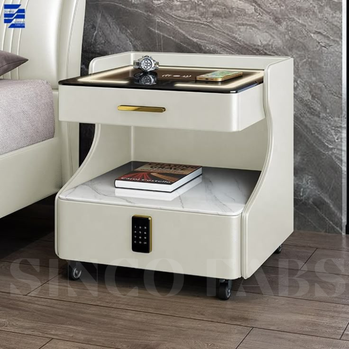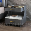 Enhance your bedroom in Thrissur with the Lumina Glide Nocturne nightstand. Its sleek grey frame features a modern LED-lit top and two spacious drawers with elegant gold-toned handles, offering both style and ample bedside storage with easy mobility.