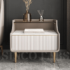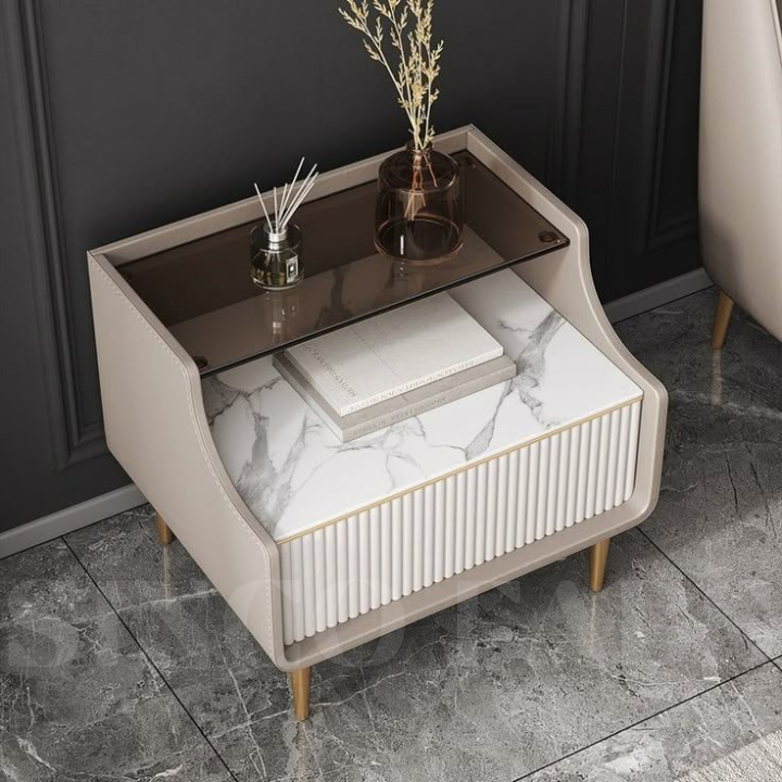 Enhance your bedroom in Thrissur with the Luxe Curve Nocturne nightstand. Its elegantly curved, light-colored upholstered frame features a sophisticated white ribbed drawer with stylish gold-toned handles and trim, topped with a luxurious stone-effect surface and a chic raised shelf.