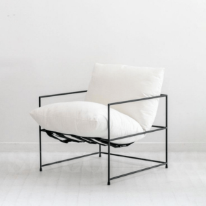 Elevate your living space in Kerala with the Noir Blanc Cloud armchair. The bold black metal frame provides a striking contrast to the sumptuously soft white cushions, offering both a visually appealing and incredibly comfortable seating experience.