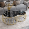 MODERN ROUND COFFEE TABLE SET FEATURING SLEEK BLACK MARBLE AND GOLD FRAMES.
