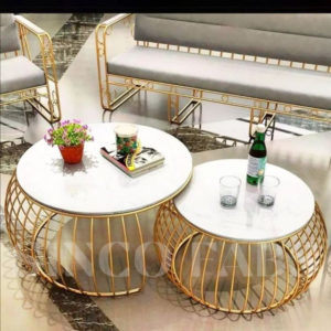 Elevate your living room with The Contour set. These modern round coffee tables feature sleek black marble tops and stylish gold wireframe bases, offering a sophisticated and contemporary touch to your home.
