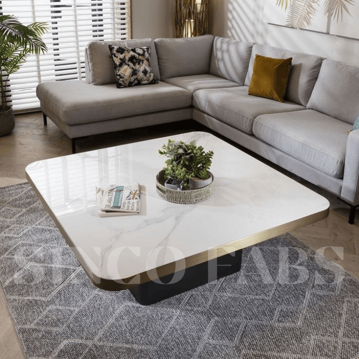 Indulge in premium quality with the Quatropi Coffee Table. Featuring a flawless white ceramic marble top and a meticulously finished gold-toned metal base, this large coffee table exudes luxury and sophistication. It’s a timeless addition to any well-appointed Indian home, promising both beauty and lasting value.