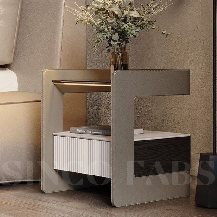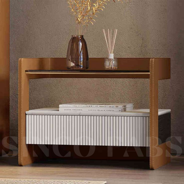 Bring a touch of refined simplicity to your Thrissur bedroom with the Serene Curve Stow nightstand. Its smooth, light-colored frame features a sleek glass top and a stylish white ribbed drawer, offering both aesthetic appeal and practical storage.